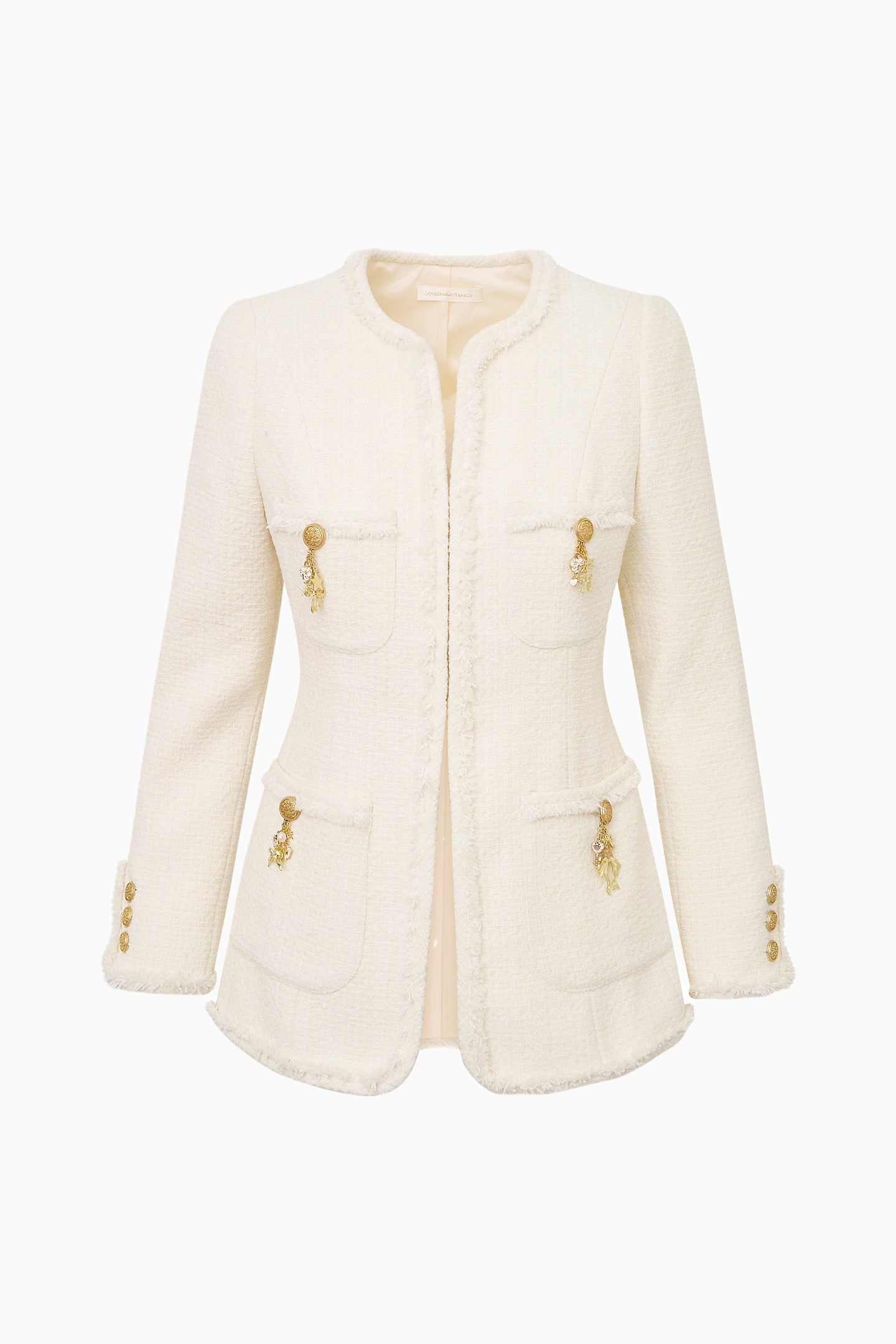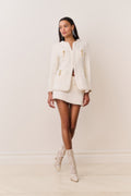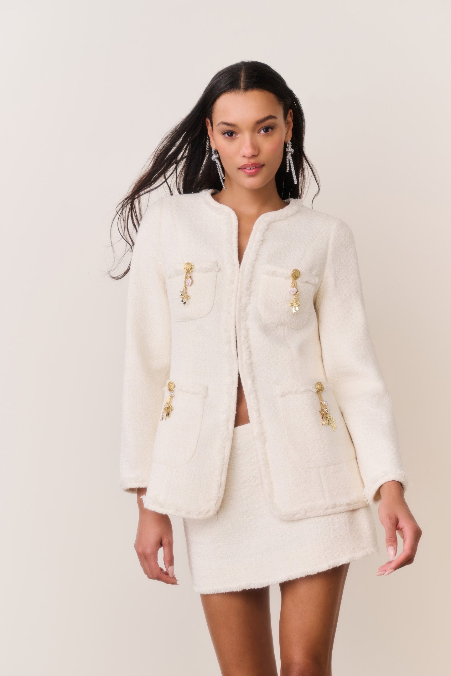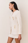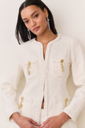 The Adrina Jacket is a polished take on classic tailoring, designed from our medium-weight textured tweed. Frayed edges soften the structured silhouette, while whimsical military-style buttons adorned with charms in stars, moons, and hearts add a signature LoveShackFancy touch. Pair with our Breya Skirt for the full set.