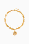 The Augusta necklace from Jennifer Behr is crafted of thick 18K-gold-plated brass centered by a charm with a sculpted relief motif, framed in a twisted circle.