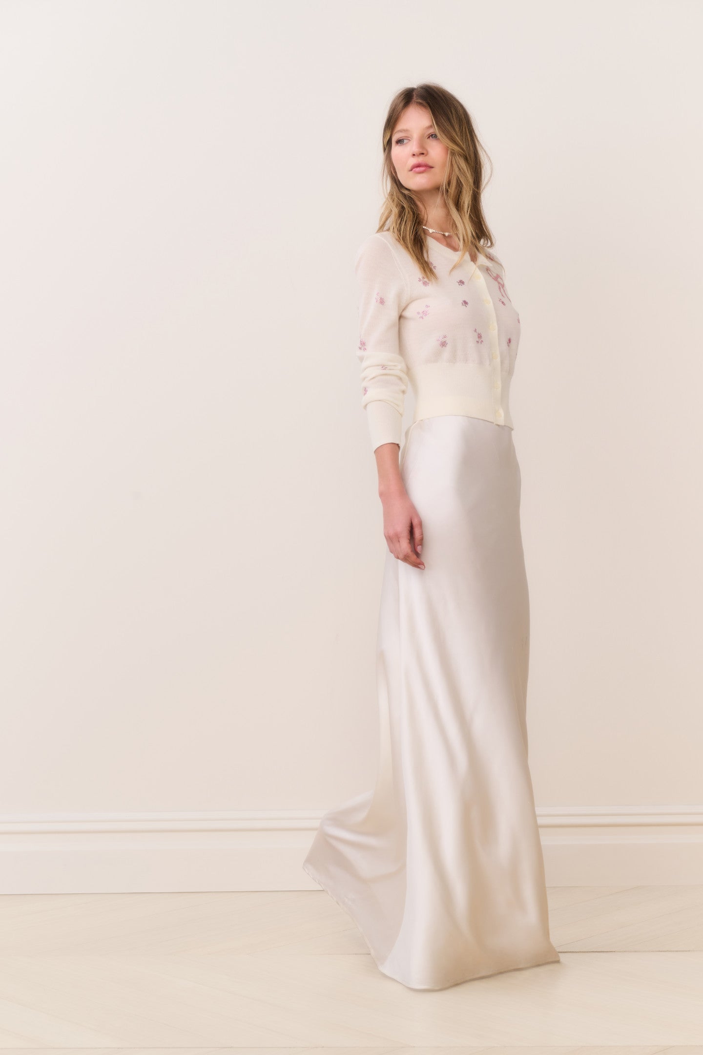 Effortlessly romantic, the Maurine Skirt debuts as part of our Secret Crush capsule. Designed from a soft, drapey charmeuse with delicate embroidered lace, this floor-length maxi moves with a slinky, fluid grace. Cut on the bias for a flattering, forgiving fit, it skims the body before gently flaring into a fishtail silhouette for subtle drama. Designed with an elastic waist for easy pull-on wear, the Maurine pairs beautifully with matching camis and delicate lace tops for an ethereal, timeless look.