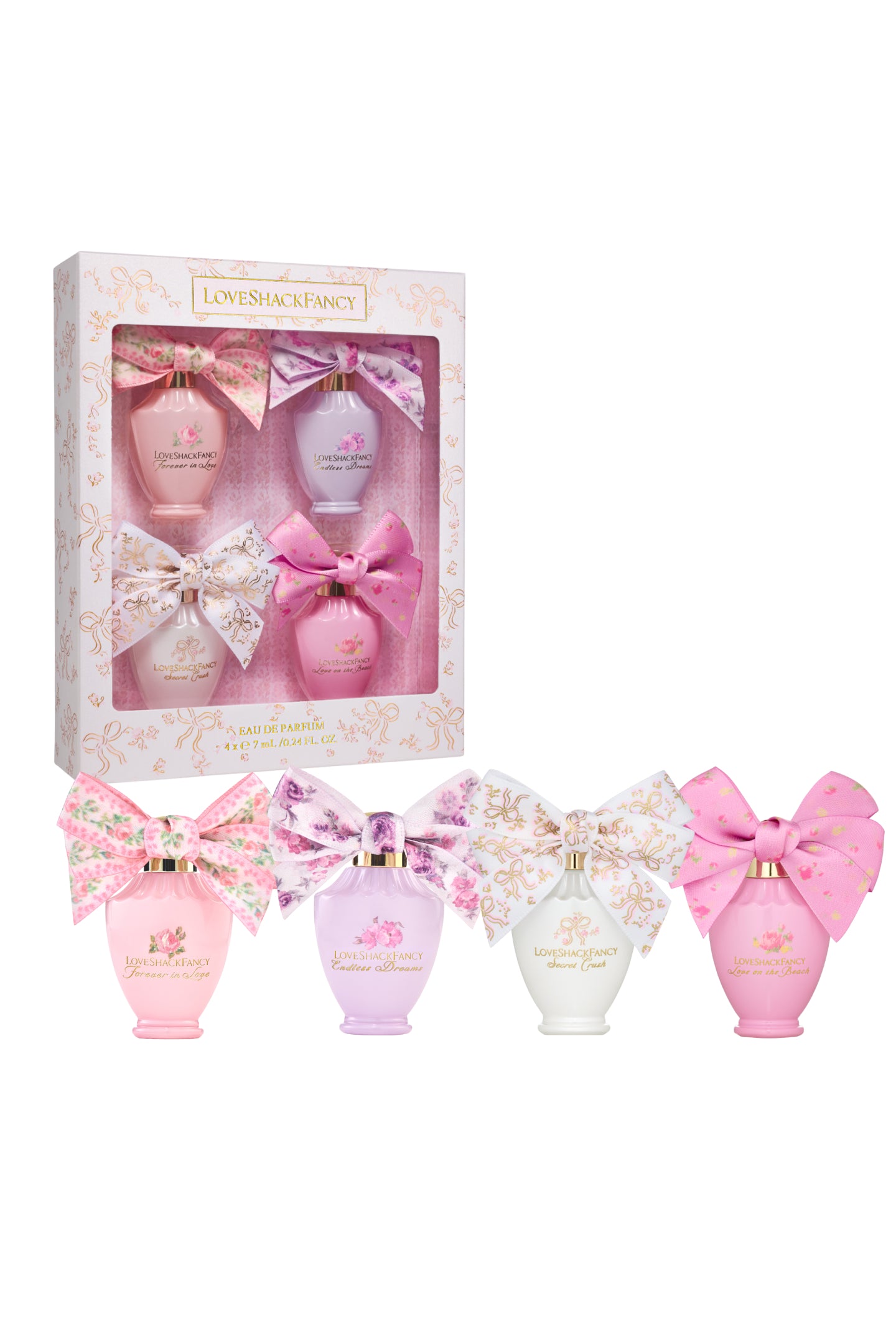 Everything's better with a bow. This adorably mini LoveShackFancy perfume bottle comes with a precious dabber to apply perfume whenever you want, and a detachable bow that you can wear in your hair. The exclusive prints are straight from the LoveShackFancy print and lace library.