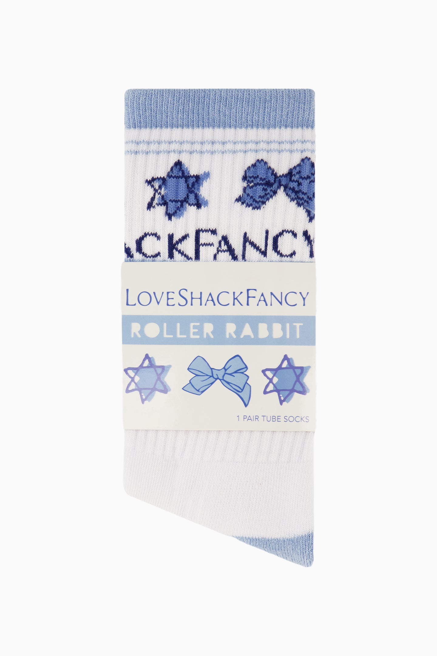 Cozy and cute from head to toe with our Tube Socks from our LoveShackFancy x Roller Rabbit collab featuring our Hanukkah-inspired print.