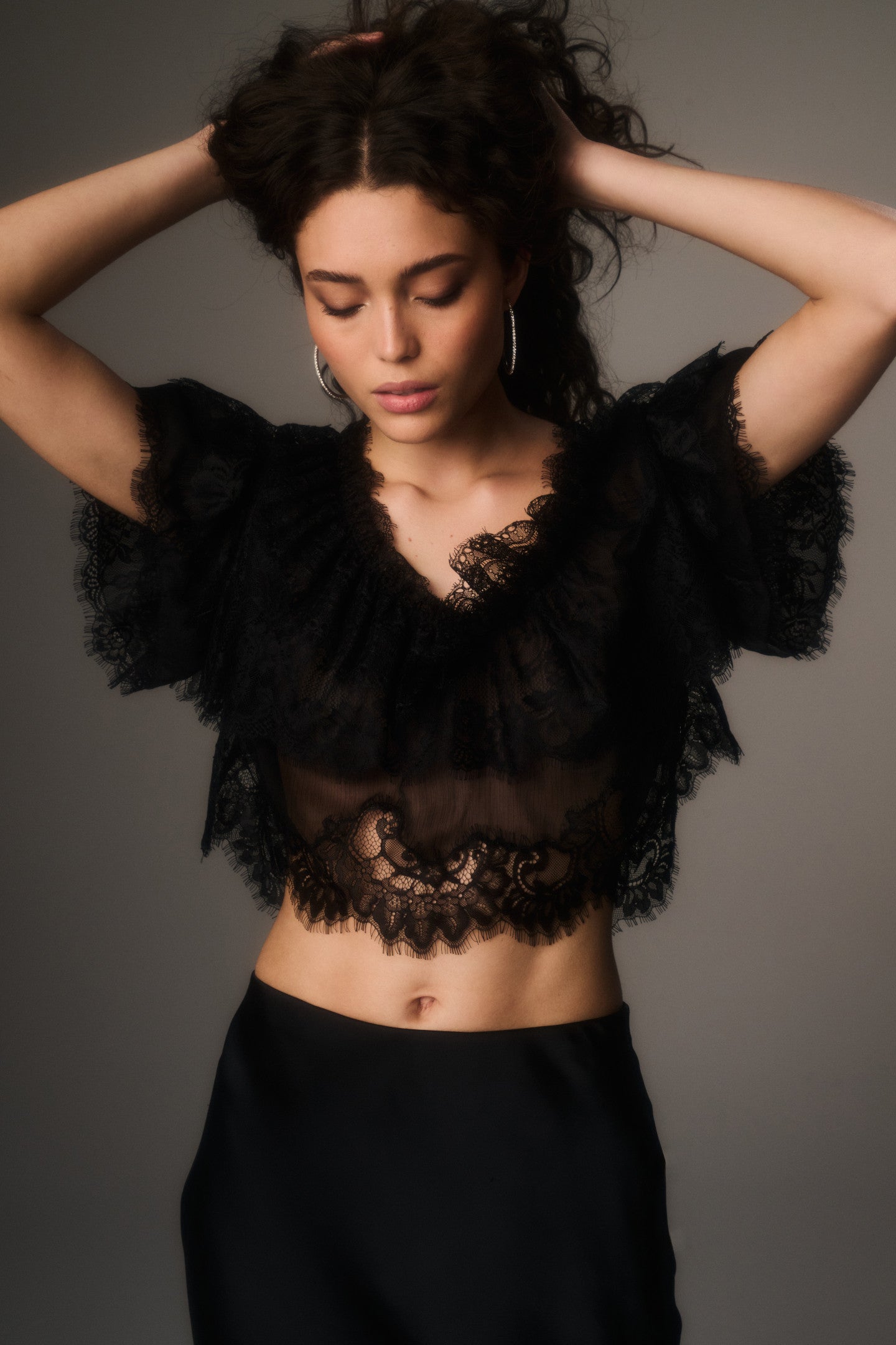 Introducing the Vienne Top. This stunning piece features sheer, lace chiffon all over giving this top a Bohemian-inspired look. With ruffles and layers abound, the top has short sleeves, an open scoop neck, and hits just below the natural waist.